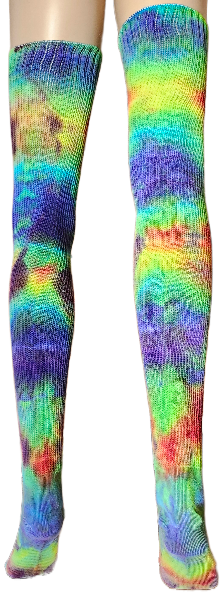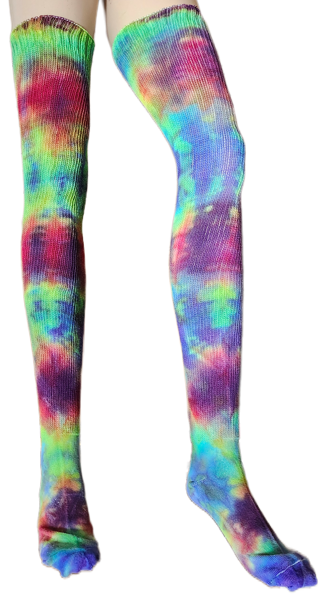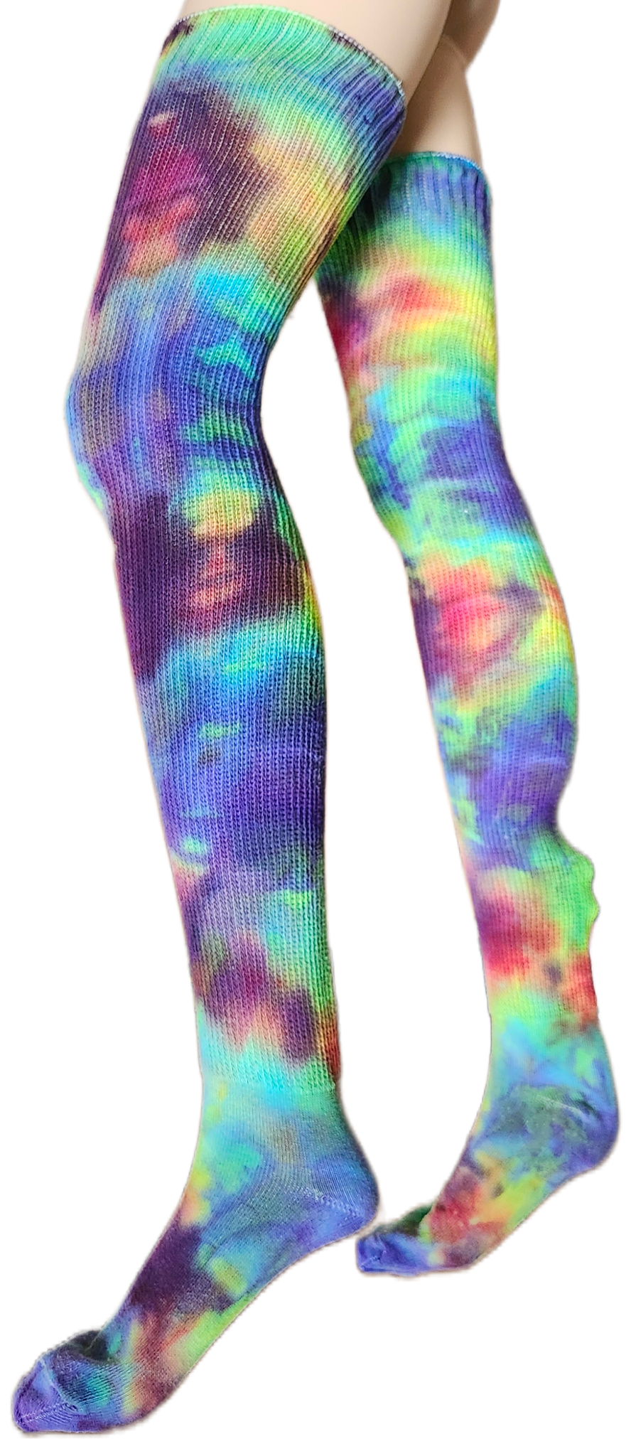 These gorgeous and comfortable socks are exactly what you didn’t even know you needed! Made in USA, these soft-knit, cotton blend socks have been dyed to perfection in Eastern NC; using fiber-reactive dye product, ensuring vibrant and lasting results. While they’re sure to keep you warm, these beauties aren’t only for the cold season! Find them hugging the curves of the sassiest festival-goers, or slouched to the ankle bringing a throwback leg-warmer look to your fishnet fierceness! Try them with a garter belt, layered over leggings, hidden under sweats, protected by your pants, and enjoy watching them while they dance! You’re going to want a pair for every day of the week, so get em while they last!