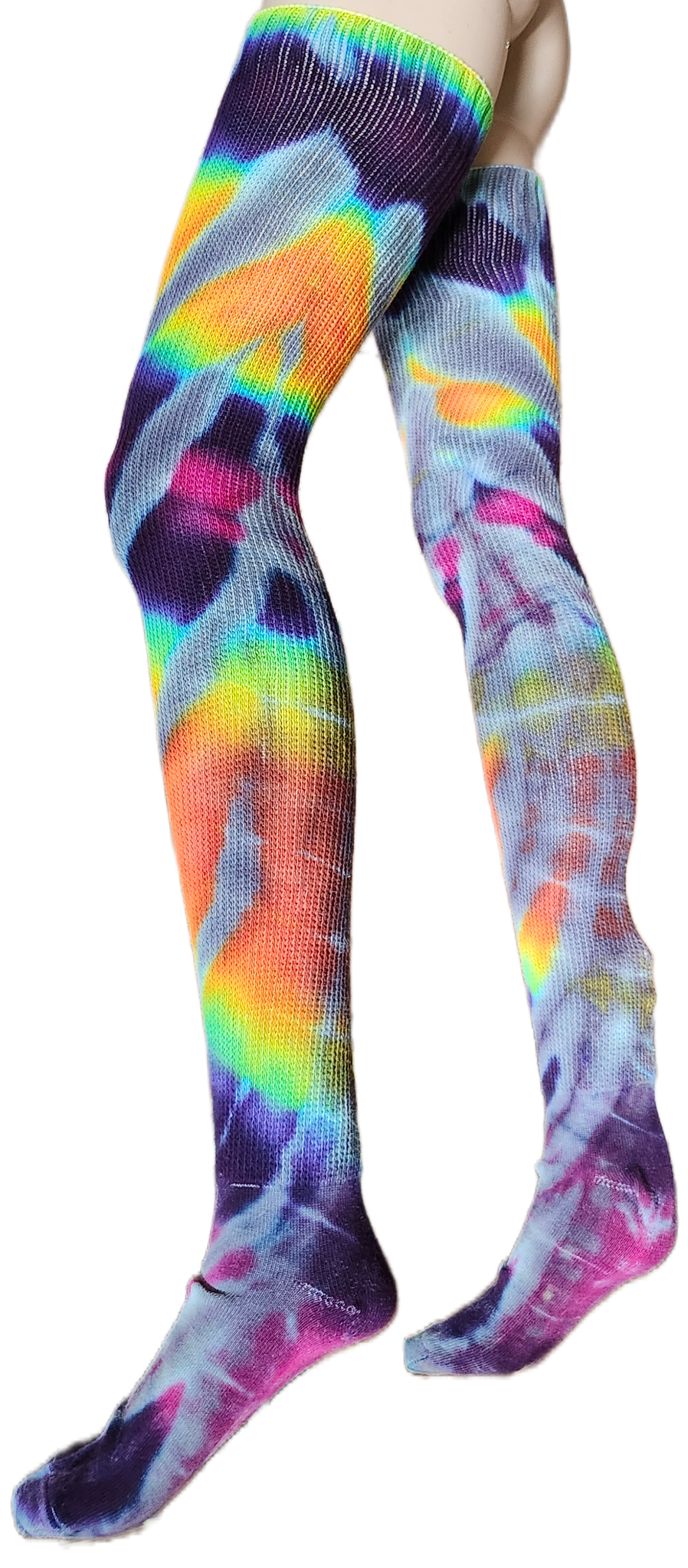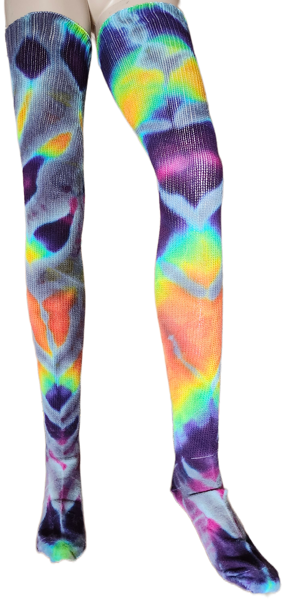 These gorgeous and comfortable socks are exactly what you didn’t even know you needed! Made in USA, these soft-knit, cotton blend socks have been dyed to perfection in Eastern NC; using fiber-reactive dye product, ensuring vibrant and lasting results. While they’re sure to keep you warm, these beauties aren’t only for the cold season! Find them hugging the curves of the sassiest festival-goers, or slouched to the ankle bringing a throwback leg-warmer look to your fishnet fierceness! Try them with a garter belt, layered over leggings, hidden under sweats, protected by your pants, and enjoy watching them while they dance! You’re going to want a pair for every day of the week, so get em while they last!