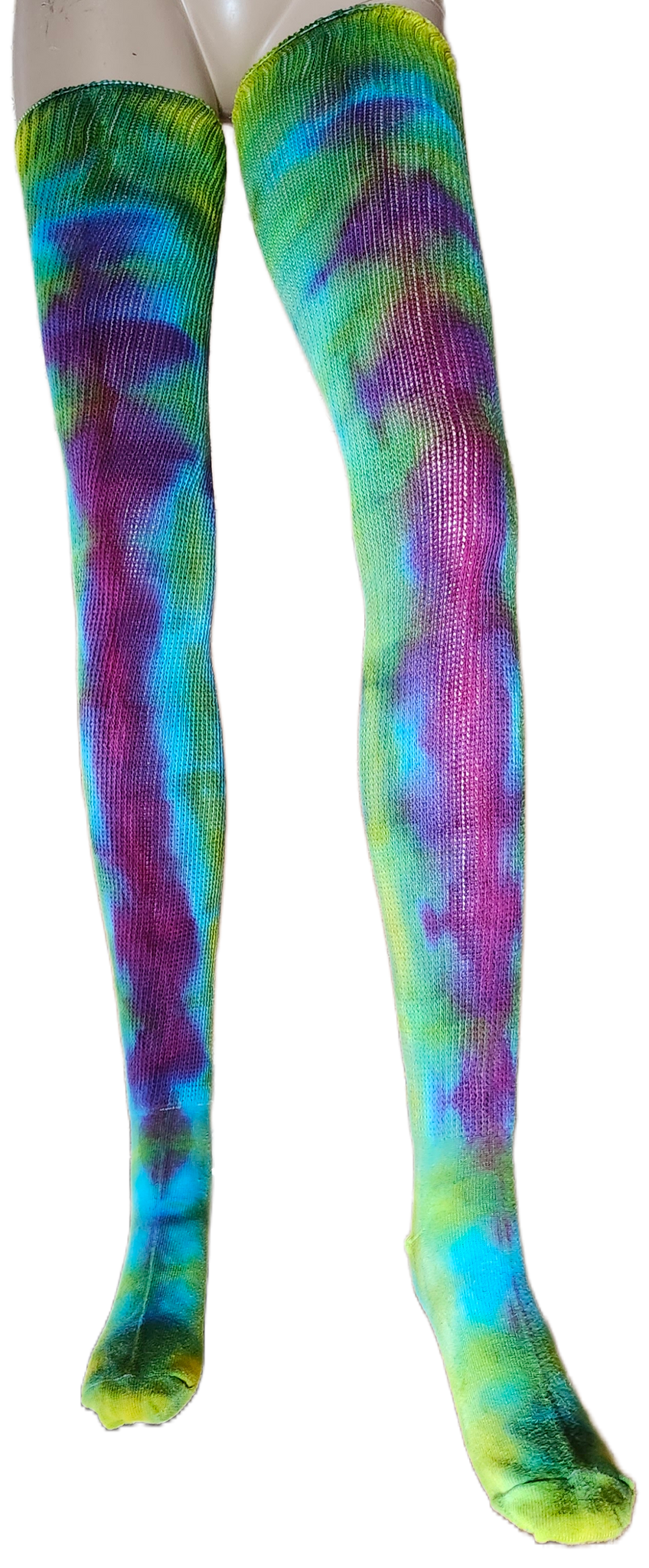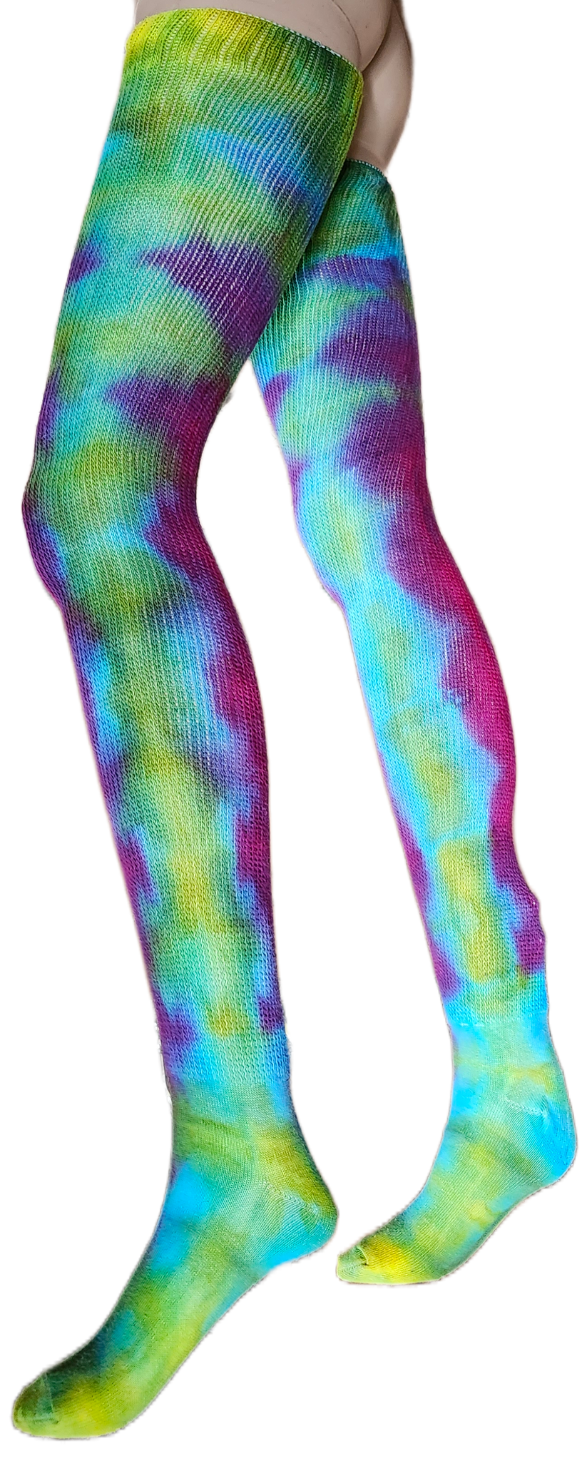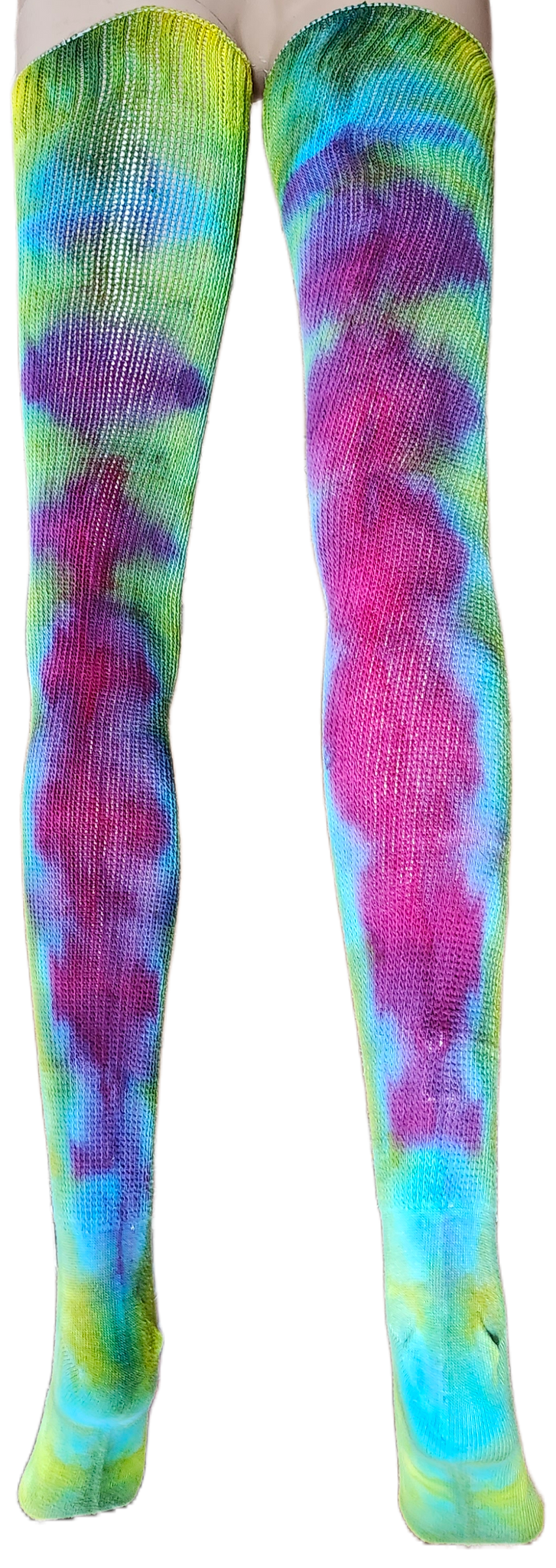 These gorgeous and comfortable socks are exactly what you didn’t even know you needed! Made in USA, these soft-knit, cotton blend socks have been dyed to perfection in Eastern NC; using fiber-reactive dye product, ensuring vibrant and lasting results. While they’re sure to keep you warm, these beauties aren’t only for the cold season! Find them hugging the curves of the sassiest festival-goers, or slouched to the ankle bringing a throwback leg-warmer look to your fishnet fierceness! Try them with a garter belt, layered over leggings, hidden under sweats, protected by your pants, and enjoy watching them while they dance! You’re going to want a pair for every day of the week, so get em while they last!